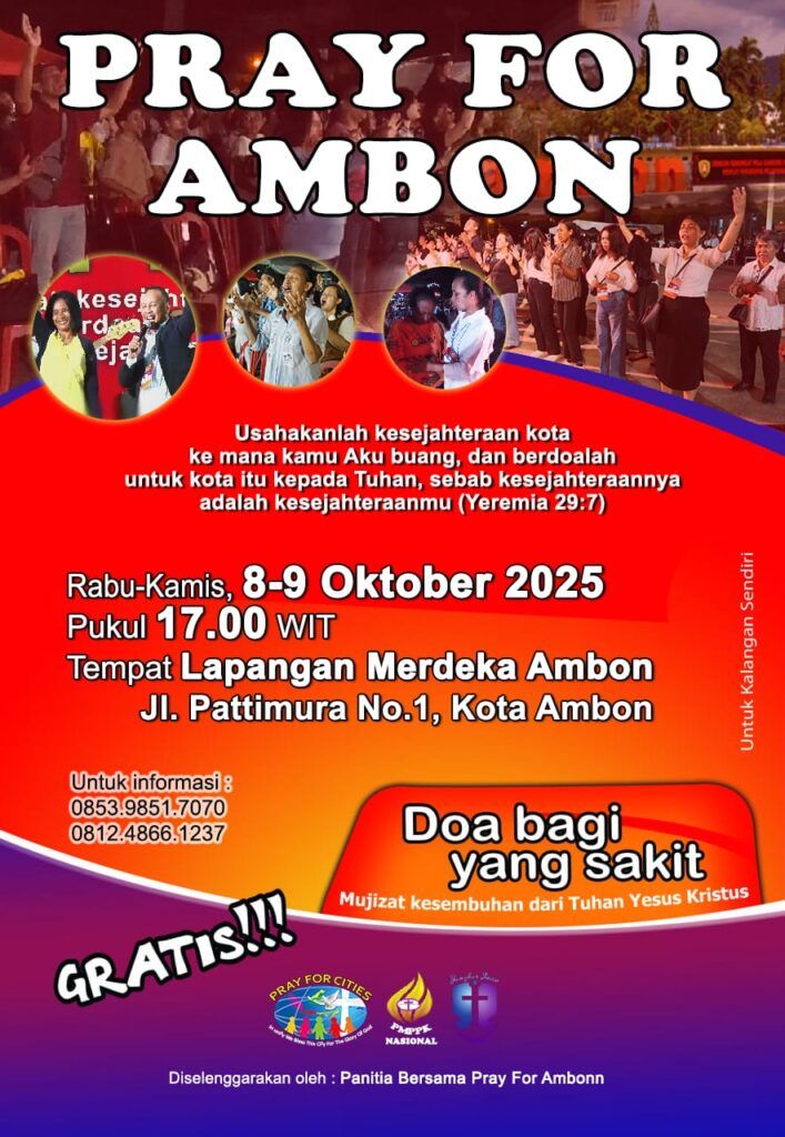 Ambon, Maluku– Kerinduan umat Tuhan untuk melihat Ambon hidup dalam damai sejahtera akan diwujudkan melalui kegiatan Pray For Ambon 2025, yang digelar pada 8 Oktober sampai dengan tanggal 9 Oktober 2025 pukul 17.00 WIT di Lapangan Merdeka Ambon.