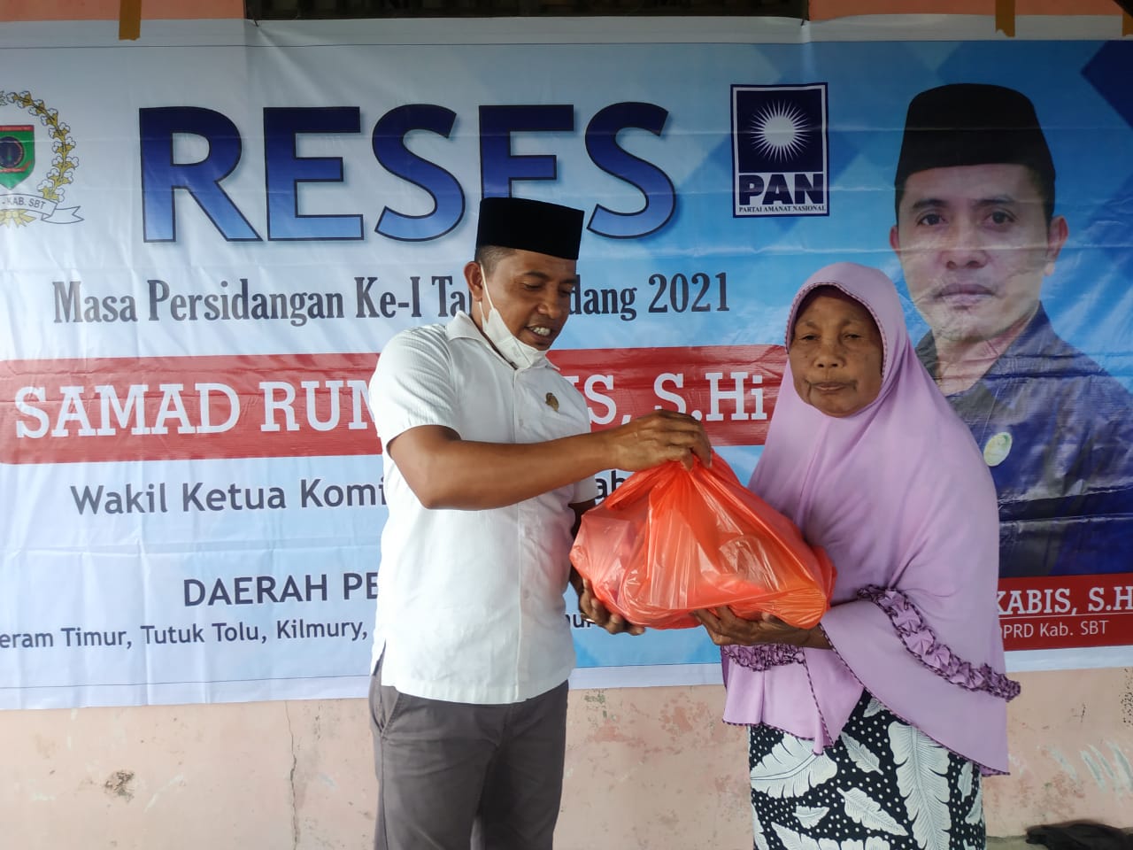 SBT,CakraNEWS.ID- Anggota Dewan Perwakilan Rakyat Daerah (DPRD) Kabupaten Seram Bagian (SBT), Samad Rumakabis, dari Partai Amanat Nasional (PAN) melaksanakan reses masa sidang pertama tahun 2021 sekaligus membagikan paket sembako kepada warga di Negeri Kian, dan Rumfakar, Kecamatan Kiandarat, Rabu (05/5/2021). Kegiatan reses ini dirasakan berbeda oleh peserta yang hadir karena harus mengikuti protokol kesehatan yang ketat sesuai anjuran pemerintah.