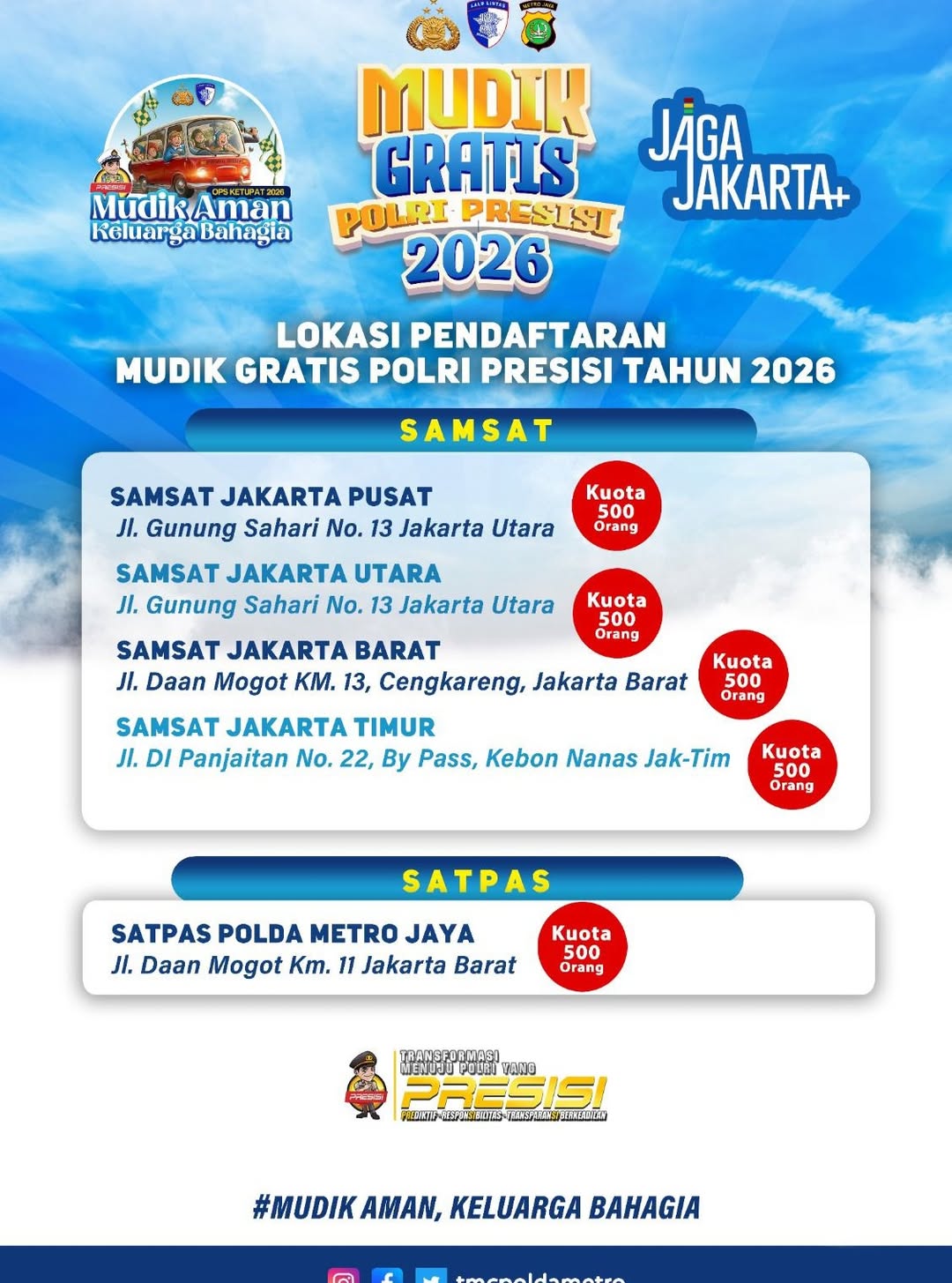 Setiap lokasi pendaftaran disediakan kuota sekitar 500 peserta. Para pemudik yang telah terdaftar dijadwalkan diberangkatkan pada Rabu (18/3/2026) pukul 10.00 WIB dari Lapangan Polda Metro Jaya.