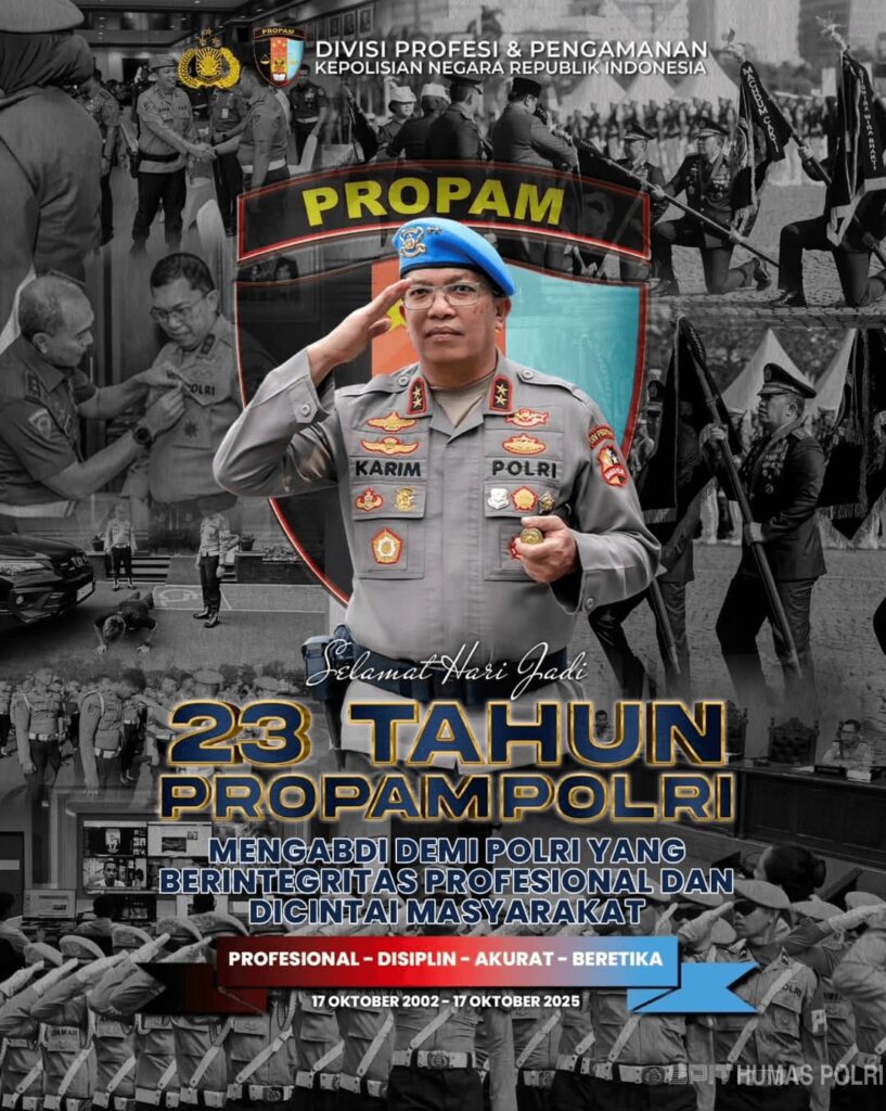 Jakarta,CakraNEWS.ID-Divisi Profesi dan Pengamanan (Propam) Polri memperingati hari jadinya yang ke-23 pada Jumat (17/10/2025). Kadiv Propam Polri, Irjen Pol Abdul Karim, menyampaikan harapannya agar momentum ulang tahun ini menjadi dorongan bagi seluruh jajaran Propam untuk semakin profesional, berintegritas, dan beretika dalam menjalankan tugas pengawasan internal di tubuh Polri.