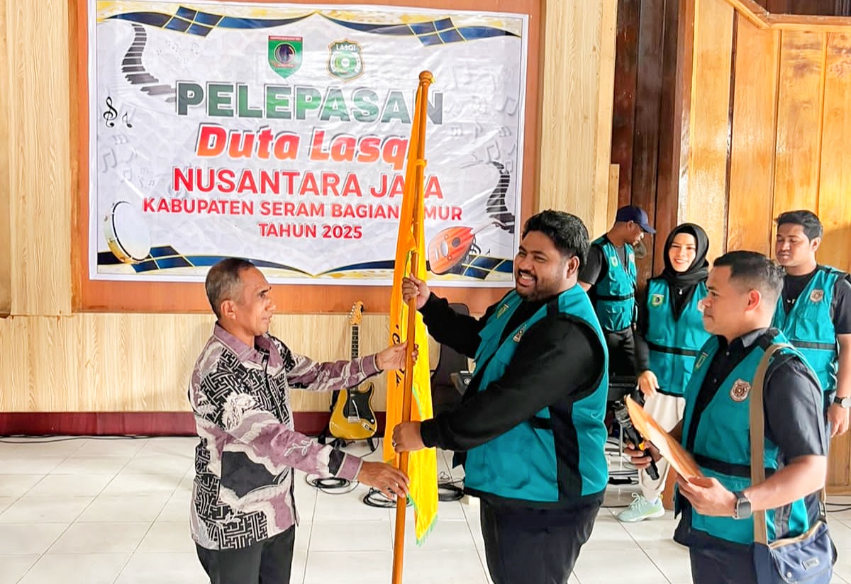 Sekda SBT Ahmad Q. Amahoru secara simbolis menyerahkan bendera LASQI kepada Ketua DPD LASQI Kabupaten SBT Muh. Miftah Thoha R. Wattimena sebagai tanda pelepasan resmi para duta yang akan mewakili daerah pada ajang LASQI Nusantara Jaya Tahun 2025.